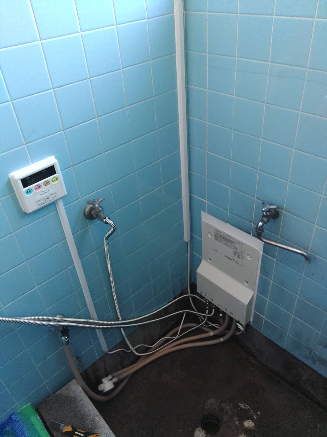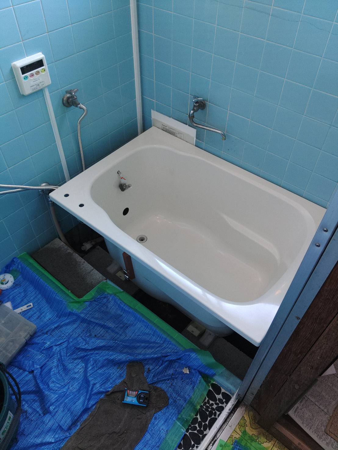 「築年数38年のアパート」で配管の錆と排水の詰りが原因。沸かし過ぎてユニットも傍聴していた為、新規ユニット設置の為、バランス釜を撤去し配線を引きリモコンで追い炊き、自動沸かし機能付きに新設工事&浴室壁の塗装をしました。